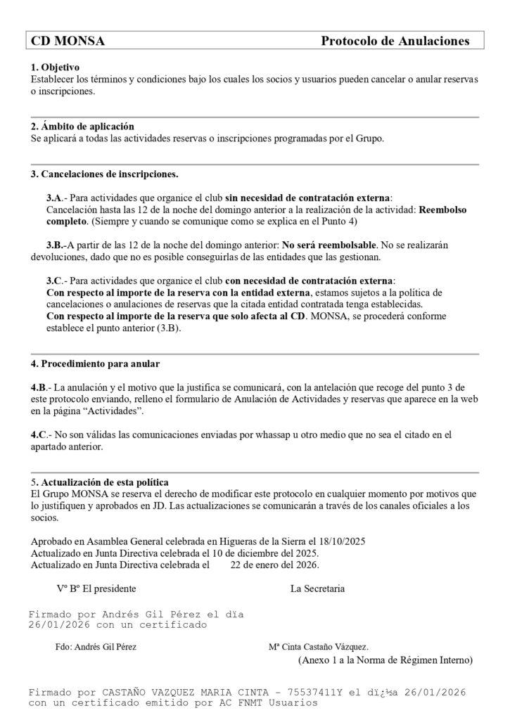 Protocolo de anulaciones de reservas e inscripciones